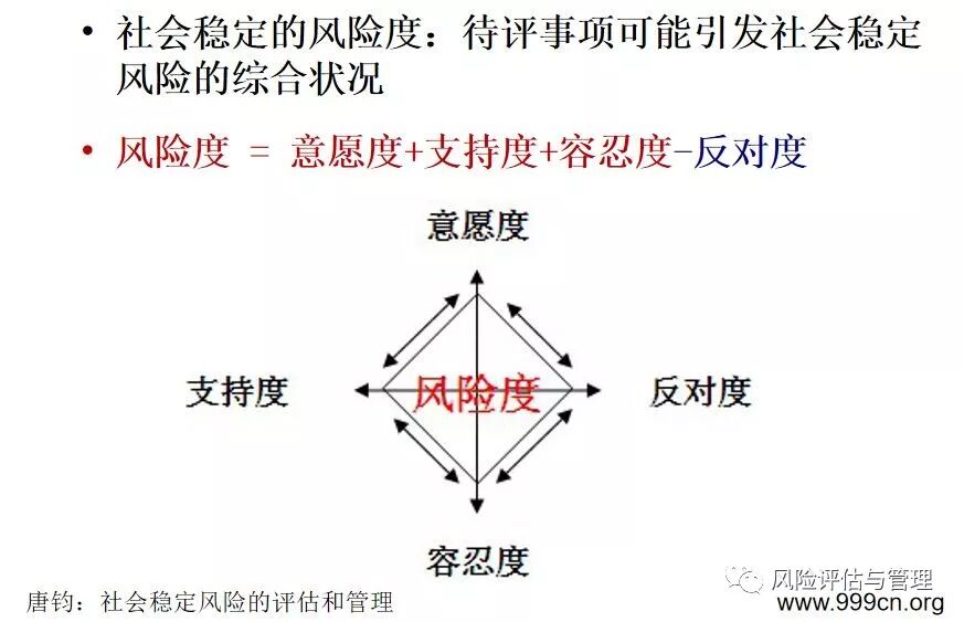 第二,采用科學的穩(wěn)評方法。在唐鈞主任著作《社會穩(wěn)定風險評估與管理》一書中總結(jié)了科學的穩(wěn)評應包含的5大要素——意愿度、支持度、反對度、容忍度和風險度。