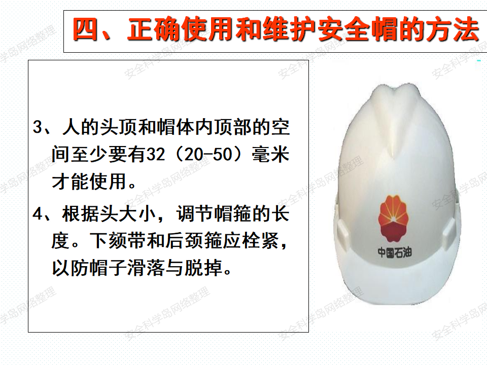 1、選用與自己頭型合適的安全帽,帽襯頂端與帽殼內(nèi)頂必須保持20-50mm的空間,形成一個(gè)能量吸收緩沖系統(tǒng),將沖擊力分布在頭蓋骨的整個(gè)面積上,減輕對(duì)頭部的傷害。