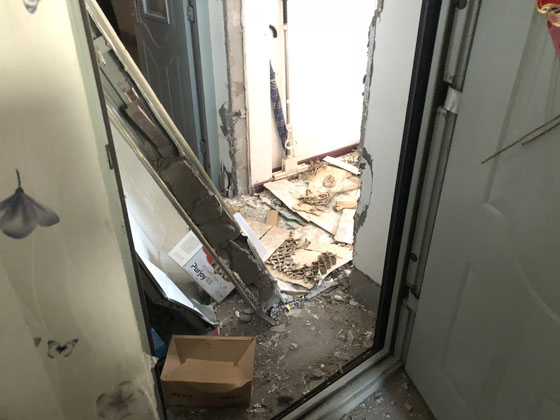 葉蘭的家住在小清河南路附近某小區(qū)六樓,和鄰居家在角落里兩側(cè),兩家的門不過一米左右的距離。此時(shí)他們不知道的是,鄰居家的門已被一股巨大的沖擊波頂開,整個(gè)門甚至連門框都被炸了下來,歪倒在墻面上。