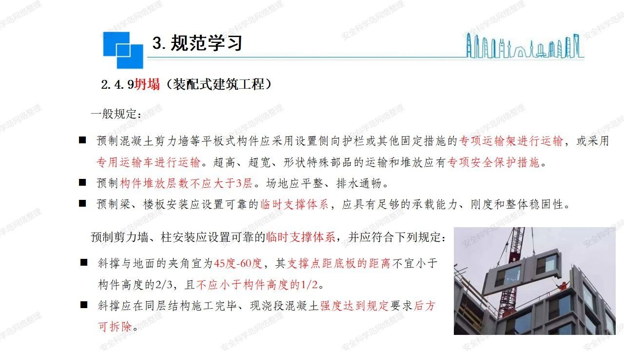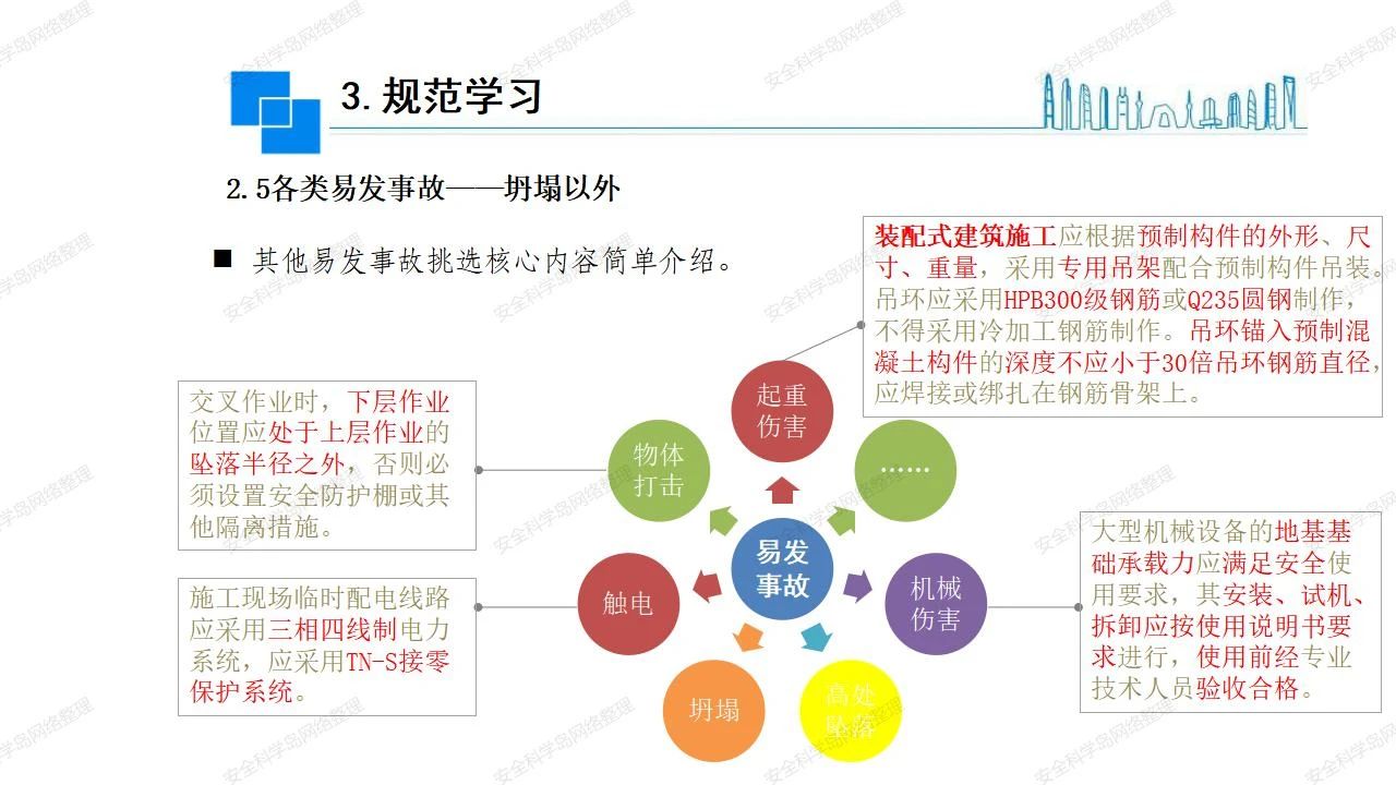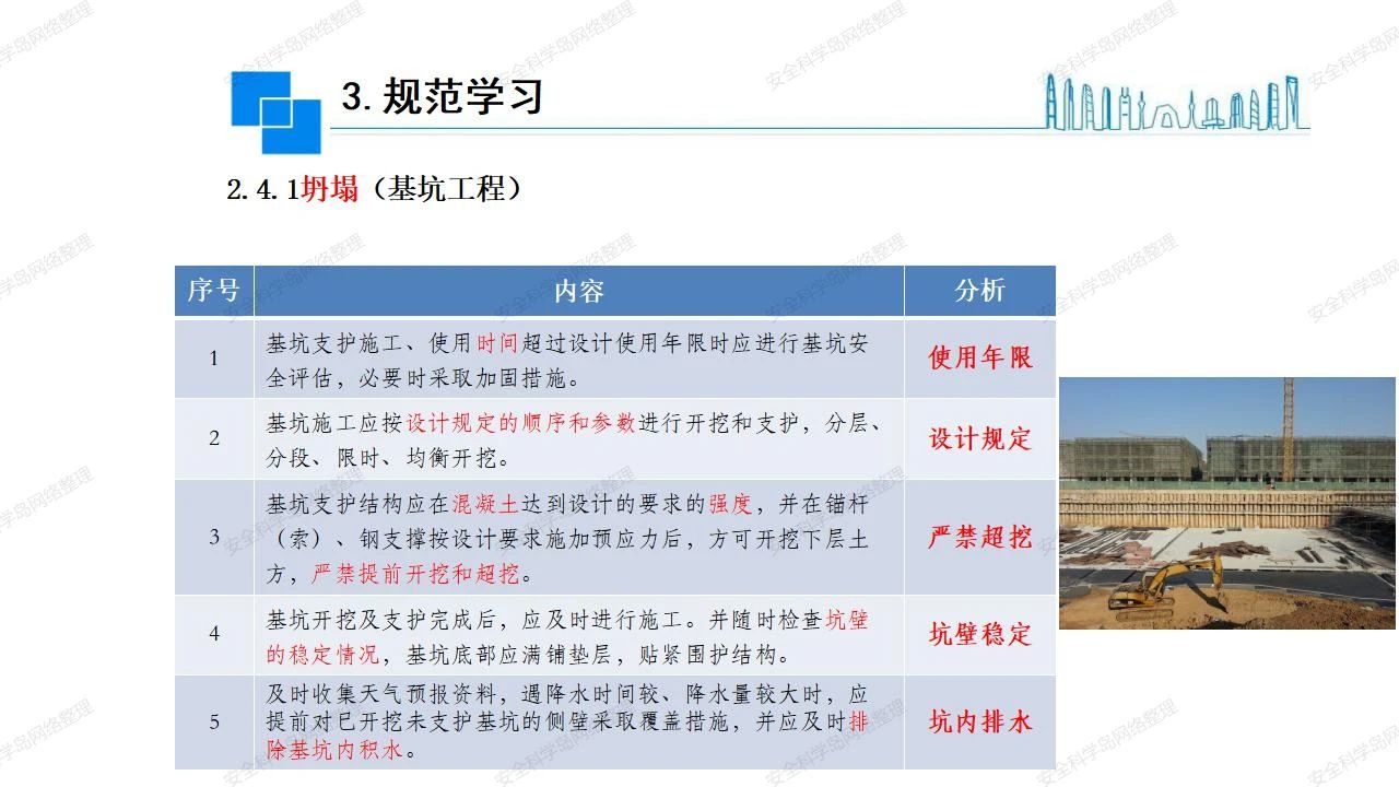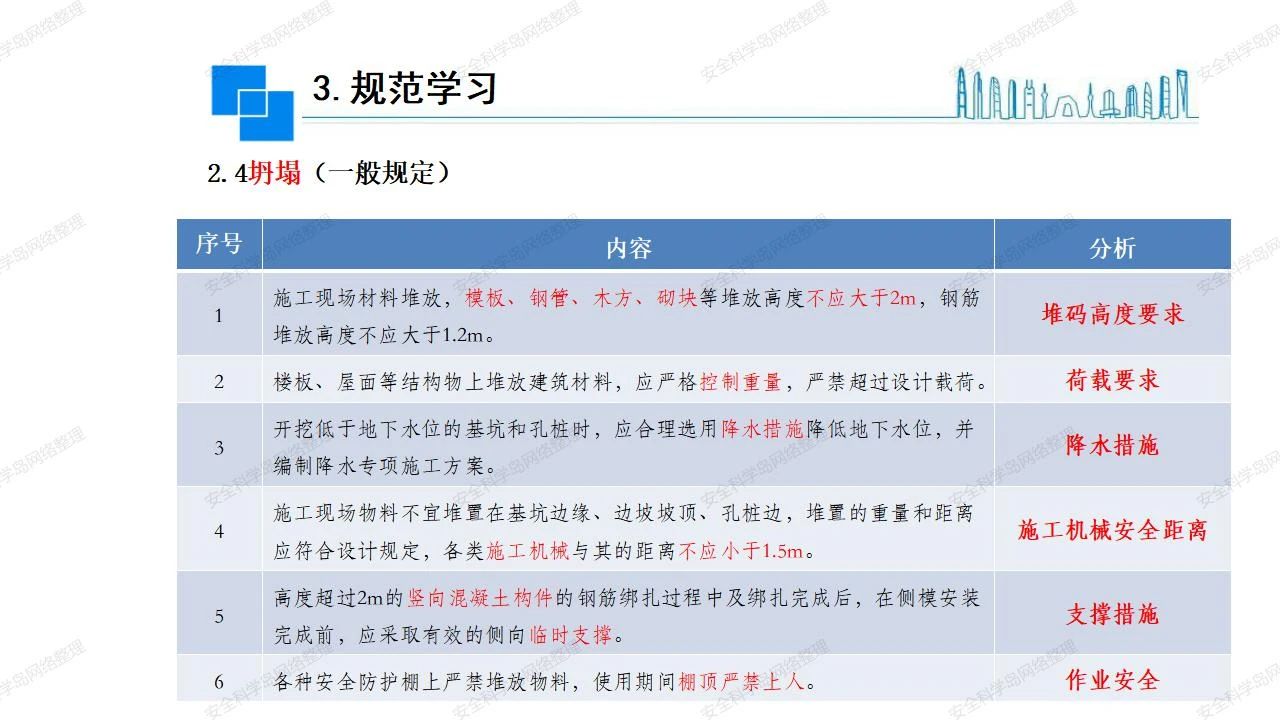 那么,坍塌事故發(fā)生的原因何在? (1)工程結(jié)構(gòu)設(shè)計(jì)不合理或計(jì)算失誤。 (2)施工前沒有編制切實(shí)可行的施工組織設(shè)計(jì)和專項(xiàng)施工方案,未做具體技術(shù)安全措施交底,特定施工項(xiàng)目未經(jīng)專家評審論證。 (3)腳手架、模板支撐、起重設(shè)備結(jié)構(gòu)設(shè)計(jì)不合理或計(jì)算失誤。 (4)建筑物結(jié)構(gòu)質(zhì)量低劣,安全性能差,地基不穩(wěn)定,不均勻沉降。 (5)建筑物結(jié)構(gòu)支撐連接(焊接)不牢固,超載、外力沖擊或嚴(yán)重偏心載荷造成失穩(wěn)等。 (6)腳手架及高大模板支架架體結(jié)構(gòu)不符合設(shè)計(jì)與規(guī)范要求,整體安全穩(wěn)定性差、超載或嚴(yán)重偏心荷載,遇外力沖擊或振動,不按程序拆除架體等因素造成失穩(wěn)等。 (7)基坑、土石方挖土?xí)r土壁不按規(guī)定留設(shè)邊坡(甚至負(fù)坡度),缺乏支護(hù)或支護(hù)不良,土質(zhì)不良或出現(xiàn)地下水、地表水的滲透,土壁經(jīng)不起重載側(cè)壓力或遇外力振動、沖擊等因素造成土壁失穩(wěn)滑坡坍塌。 (8)起重設(shè)備技術(shù)安全性能差,結(jié)構(gòu)強(qiáng)度不夠,安全防護(hù)裝置不完善,垂直起重機(jī)與建筑物拉結(jié)差,出現(xiàn)超載、碰撞、升降過度或違章操作等原因,造成起重設(shè)備倒塌。 (9)現(xiàn)場作業(yè)環(huán)境不良,安全防護(hù)設(shè)施缺乏。 (10)施工現(xiàn)場管理松弛,各項(xiàng)質(zhì)量、安全管理制度流于形式。 (11)片面追求經(jīng)濟(jì)利益,偷工減料,施工質(zhì)量差。 (12)施工隊(duì)伍素質(zhì)差,不執(zhí)行法規(guī)、標(biāo)準(zhǔn),違章指揮、違章作業(yè),思想上存在盲目性、冒險性、隨意性。 如何預(yù)防坍塌事故? (1)根據(jù)設(shè)計(jì)與規(guī)范要求,認(rèn)真編制施工組織設(shè)計(jì)和專項(xiàng)施工技術(shù)方案、應(yīng)急預(yù)案,做好特定施工項(xiàng)目專家評審論證及技術(shù)安全交底工作。 (2)支架、腳手架等搭設(shè)完成后應(yīng)組織相關(guān)部門驗(yàn)收。支架還應(yīng)按方案要求進(jìn)行堆載預(yù)壓。 (3)嚴(yán)格控制模板支架、腳手架等承受的荷載,模板、腳手架及其支撐體系的施工荷載應(yīng)做到均勻分布,并不得超過設(shè)計(jì)要求。嚴(yán)禁超載、對構(gòu)筑物進(jìn)行外力沖擊或偏心載荷。 (4)基坑、土石方挖土?xí)r土壁按規(guī)定留設(shè)邊坡,嚴(yán)格按照設(shè)計(jì)坡度進(jìn)行放坡開挖,進(jìn)行有效支護(hù)和排水,并設(shè)置專人對邊坡穩(wěn)定性進(jìn)行檢測?;討?yīng)基坑頂邊緣1m范圍內(nèi)禁止堆放材料。 (5)加強(qiáng)起重設(shè)備的采購管理,嚴(yán)禁使用不合格的起重設(shè)備,并定期進(jìn)行檢測,確保各項(xiàng)性能和安全防護(hù)裝置良好;加強(qiáng)起重設(shè)備的安裝、拆除管理;加強(qiáng)起重設(shè)備的使用管理,嚴(yán)禁超載、碰撞或違章操作;加強(qiáng)對起重設(shè)備操作人員、指揮人員、安拆人員的安全教育培訓(xùn),考核合格后持證上崗。 (6)加強(qiáng)施工現(xiàn)場管理,設(shè)置有效安全防護(hù)設(shè)施。 (7)加強(qiáng)對從業(yè)人員的培訓(xùn)教育,提高隊(duì)伍素質(zhì),強(qiáng)化質(zhì)量、安全意識。 (8)強(qiáng)化工程質(zhì)量報驗(yàn)和檢驗(yàn)、簽證制度,不經(jīng)檢驗(yàn)合格,不準(zhǔn)進(jìn)行下道工序施工。 (9)發(fā)現(xiàn)坍塌事故的險情,要認(rèn)真分析原因,積極研究提出排除隱患的整改措施,并監(jiān)督執(zhí)行。
