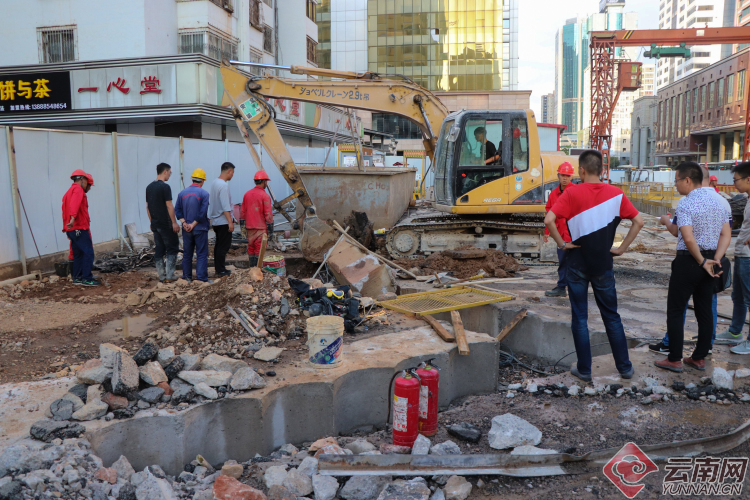 記者在現(xiàn)場看到,中鐵十八局、燃氣公司、消防單位、交警單位、軌道公司等工作人員正在事發(fā)區(qū)域進行搶修,一輛消防車??吭谑┕鷵鯄ν?,一輛標有昆明煤氣的搶修車輛及兩輛標有云南中石油昆侖燃氣的燃氣搶險車輛停在施工區(qū)域內,另有一臺挖掘機正在作業(yè),一旁的交通信號燈已經熄滅,交警在交叉口指揮疏導通行車輛。