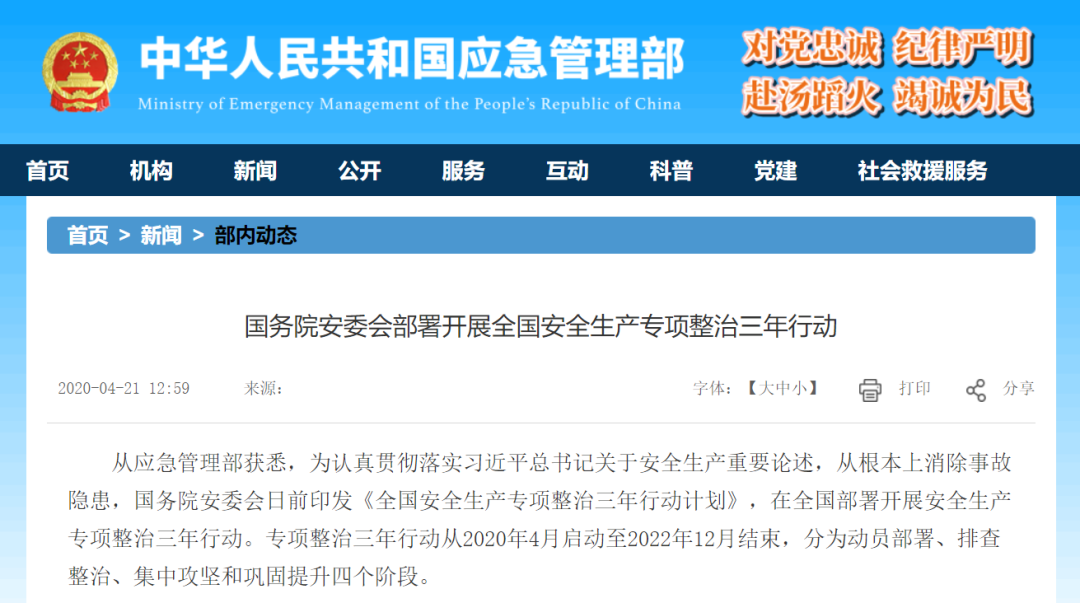 為認(rèn)真貫徹落實(shí)習(xí)近平總書記關(guān)于安全生產(chǎn)重要論述,從根本上消除事故隱患,國(guó)務(wù)院安委會(huì)日前印發(fā)《全國(guó)安全生產(chǎn)專項(xiàng)整治三年行動(dòng)計(jì)劃》,在全國(guó)部署開展安全生產(chǎn)專項(xiàng)整治三年行動(dòng)。專項(xiàng)整治三年行動(dòng)從2020年4月啟動(dòng)至2022年12月結(jié)束,分為動(dòng)員部署、排查整治、集中攻堅(jiān)和鞏固提升四個(gè)階段。